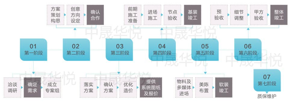 服務(wù)流程 中晟華悅項目服務(wù)流程圖: 中晟華悅多年服務(wù)流程與項目經(jīng)驗,以實現(xiàn)項目順利高效完成為目的,對甲方提供整個展館建設(shè)的前期準備及推進程序,請悉知。